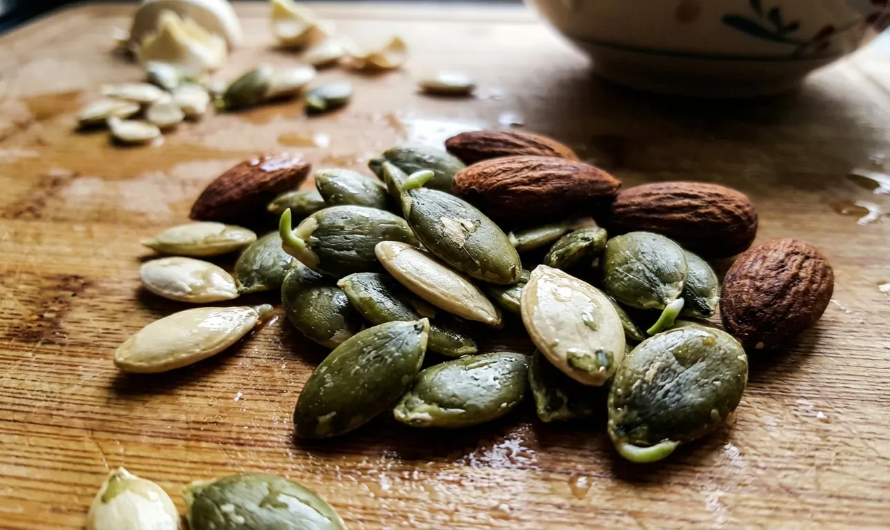 Uzmite malu šaku sirovih sjemenki bundeve ili neoljuštenih badema
